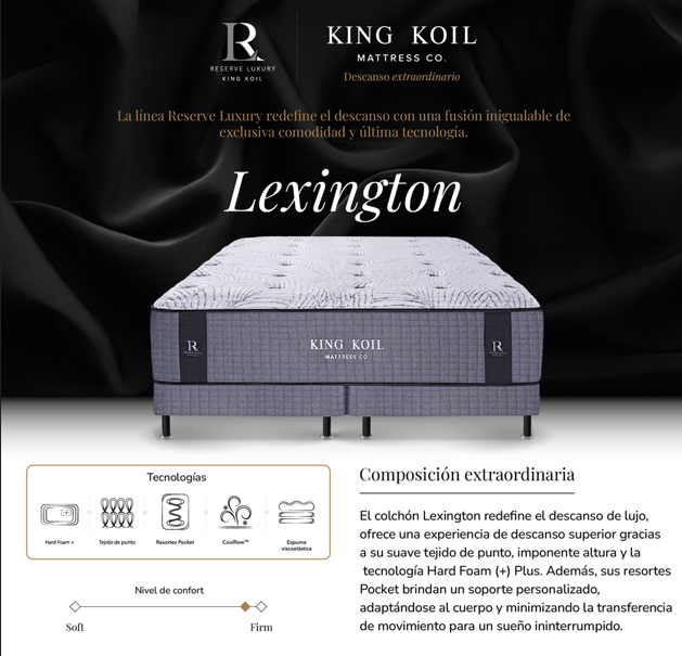 Conjunto Colchón de Resortes King Koil y Sommier King Koil. El producto de mayor altura, lujo y sofisticación de la línea World Luxury, ofrece una superficie de contacto extremadamente suave a partir de su tejido de punto 3D, con destacados diseños que aumentan el placer de tu descanso. Su elegancia se combina con la tecnología exclusiva de Posture® Technology, generando un sistema de descanso de gran adaptabilidad, que se activará en cuanto tu cuerpo tome contacto con el colchón, brindándote un mayor confort.